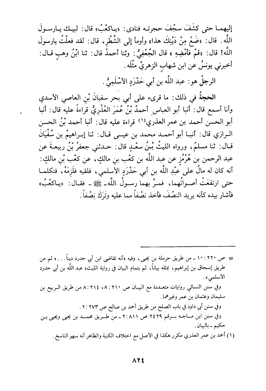 وَقُرِئَ أَيْضًا عَلَى أَبِي الْوَلِيدِ أَحْمَدُ بْنُ عَبْدِ اللَّهِ بْنِ طريف وَأَنَا أَسْمَعُ قَالُوا قَرَأْنَا عَلَى أَبِي الْقَاسِمِ حَاتِمِ بْنِ مُحَمَّدٍ قَالَ أَنْبَأَ عَلِيُّ بْنُ مُحَمَّدٍ الْقَابِسِيُّ عَنْ أَبِي زَيْدٍ مُحَمَّدِ بْنِ أَحْمَدَ قَالَ ثَنَا مُحَمَّدُ بْنُ يُوسُفَ قَالَ ثَنَا مُحَمَّدُ بْنُ إِسْمَاعِيلَ الْجُعْفِيُّ قَالَ ثَنَا عَبْدُ اللَّهِ بْنُ مُحَمَّدٍ قَالَ ثَنَا عُثْمَانُ بْنُ عُمَرَ قَالَ أَخْبَرَنَا يُونُسُ عَنِ الزُّهْرِيِّ عَنْ عَبْدِ اللَّهِ بْنِ كَعْبِ بْنِ مَالِكٍ عَنْ كَعْبٍ أَنَّهُ تَقَاضَى ابْنَ أَبِي حَدْرَدٍ دَيْنًا كَانَ لَهُ عَلَيْهِ فِي الْمَسْجِدِ فَارْتَفَعَتْ أَصْوَاتُهُمَا حَتَّى سَمِعَهَا رَسُولُ اللَّهِ صَلَّى اللَّهُ عَلَيْهِ وَسَلَّمَ وَهُوَ فِي بَيته فَخرج