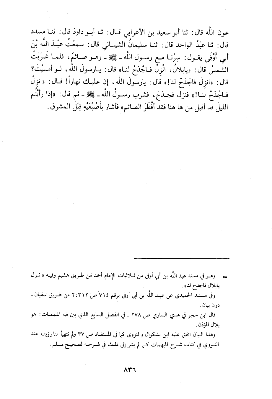 قُرِئَ عَلَى أَبِي مُحَمَّدٍ عَبْدُ الرَّحْمَنِ بْنُ مُحَمَّدِ بْنِ عَتَّابٍ رَحِمَهُ اللَّهُ وَأَنَا أَسْمَعُ عَنْ أَبِيهِ رَحِمَهُ اللَّهُ سَمَاعًا لَهُ عَنْ أَبِي الْقَاسِمِ خَلَفُ بْنُ يَحْيَى ثَنَا عَبْدُ اللَّهِ بْنُ يُوسُفَ ثَنَا ابْنُ وَضَّاحٍ عَنْ أَبِي بَكْرِ بْنِ أَبِي شَيْبَةَ قَالَ ثَنَا عَلِيٌّ وَعَبَّادُ بْنُ الْعَوَّامِ عَنِ الشَّيْبَانِيِّ عَنِ ابْنِ أَبِي أَوْفَى قَالَ كُنَّا مَعَ رَسُولِ اللَّهِ صَلَّى الله عَلَيْهِ وَسلم فِي سَفَره فَلَمَّا غَابَتِ الشَّمْسُ قَالَ لِرَجُلٍ انْزِلْ فَاجْدَحْ لَنَا قَالَ يَا رَسُولَ اللَّهِ لَوْ أَمْسَيْتَ قَالَ انْزِلْ فَاجْدَحْ لَنَا قَالَ إِنَّ عَلَيْنَا نَهَارًا قَالَ فَنَزَلَ فَجَدَحَ لَهُ فَشَرِبَ ثُمَّ قَالَ إِذَا رَأَيْتُمُ اللَّيْلَ قَدْ أَقْبَلَ مِنْ هَا هُنَا وَأَشَارَ بِيَدِهِ نَحْوَ الْمَشْرِقِ فَقَدْ أَفْطَرَ الصَّائِمُ