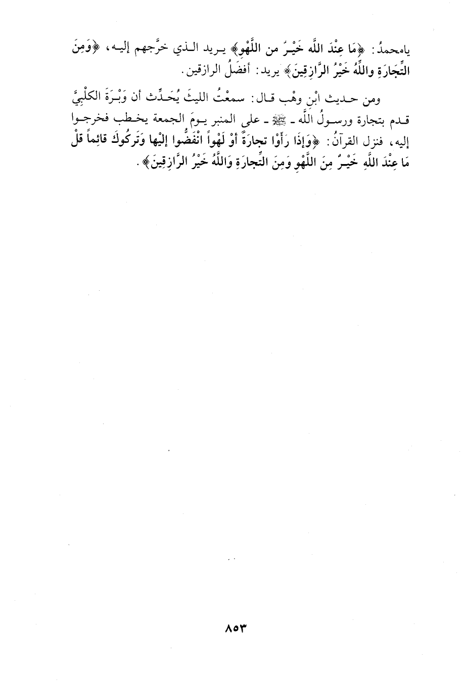 الْحجَّة فِي ذَلِك مَا أَنْبَأَ بِهِ أَبُو مُحَمَّدِ بْنُ عَتَّابٍ عَنْ أَبِيهِ عَنِ الْقَنَازِعِيِّ عَنِ النَّاجِيِّ عَنِ الْحَسَنُ بْنُ سَعْدٍ عَنْ بَقِيِّ بْنُ مَخْلَدٍ قَالَ ثَنَا ابْنُ أَبِي شَيْبَةَ قَالَ ثَنَا ابْنُ عَتَّابٍ عَنْ سُفْيَانَ عَنِ السُّدِّيِّ عَنْ مُرَّةَ قَالَ جَاءَ دِحْيَةُ الْكَلْبِيُّ إِلَى النَّبِيِّ صَلَّى اللَّهُ عَلَيْهِ وَسَلَّمَ بِتِجَارَةٍ وَالنَّبِيُّ صَلَّى اللَّهُ عَلَيْهِ وَسَلَّمَ فِي الصَّلاةِ فَخَرَجُوا إِلَيْهَا وَنَزَلَ {إِذَا نُودِيَ لِلصَّلاةِ مِنْ يَوْمِ الْجُمُعَةِ فَاسْعَوْا إِلَى ذِكْرِ اللَّهِ وَذَرُوا الْبَيْعَ} الْآيَة 9 الْجُمُعَة