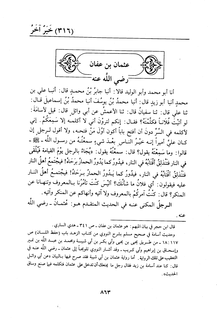 أَنْبَأَ أَبُو مُحَمَّدِ بْنُ عَتَّابٍ وَأَبُو الْوَلِيدِ بْنُ طَرِيفٍ سَمَاعًا عَلَيْهَا قَالا أنبا أَبُو الْقَاسِمِ حَاتِمُ بْنُ مُحَمَّدٍ أنبا عَلِيُّ بْنُ ابي بكر تنبا أَبُو زَيْدٍ ثَنَا مُحَمَّدُ بْنُ يُوسُفَ ثَنَا مُحَمَّدُ بْنُ إِسْمَاعِيلَ قَالَ وَقَالَ لَنَا مُحَمَّدُ بْنُ يُوسُفَ ثَنَا الأَوْزَاعِيُّ ثَنَا الزُّهْرِيُّ عَنْ حُمَيْدِ بْنِ عَبْدِ الرَّحْمَنِ عَنْ عُبَيْدِ اللَّهِ بْنِ عَدِيِّ بْنِ الْخِيَارِ إِنَّهُ دَخَلَ عَلَى عُثْمَانُ بْنُ عَفَّانَ رَضِيَ اللَّهُ عَنْهُ وَهُوَ مَحْصُورٌ فَقَالَ إِنَّكَ إِمَامُ عَامَّةٍ وَنَزَلَ بِكَ مَا تَرَى وَيُصَلِّي بِنَا إِمَامُ فِتْنَةٍ وَنَتَحَرَّجُ فَقَالَ الصَّلاةُ أَحْسَنُ مَا يعْمل النَّاسُ فَأَحْسِنْ مَعَهُمْ وَإِذَا أَسَاءُوا فَاجْتَنِبْ إِسَاءَتَهُمْ الرَّجُلُ الْمُشَارُ إِلَيْهِ فِي الْحَدِيثِ هُوَ عَبْدُ الرَّحْمَنِ بْنُ عُدَيْسٍ الْبَلَوِيُّ مِنْ كِتَابِ ابي بَحر الأسدى شَيخنَا رَحمَه الله