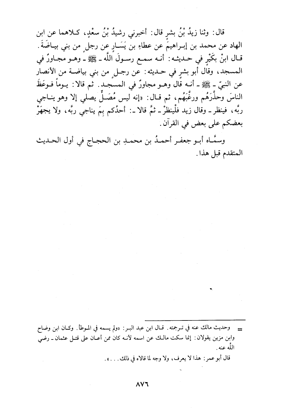 قُرِئَ عَلَى أَبِي بَحْرٍ الأَسَدِيِّ وَأَنَا أَسْمَعُ أَخْبَرَكُمْ أَبُو عُمَرَ النَّمَرِيُّ سَمَاعًا فَأَقَرَّ بِهِ قَالَ ثَنَا سَعِيدُ بْنُ نَصْرٍ عَنْ قَاسِمِ بْنِ أَصْبَغَ عَنِ ابْنِ وَضَّاحٍ عَنْ يحيى عَن مَالك عَن يحيى ين سعيج عَنْ مَالِكِ بْنِ إِبْرَاهِيمَ بْنِ الْحَارِثِ التَّيْمِيِّ عَنْ أَبِي حَازِمٍ التَّمَّارِ عَنِ الْبَيَاضِيِّ أَنَّ رَسُولَ اللَّهِ صَلَّى اللَّهُ عَلَيْهِ وَسَلَّمَ خَرَجَ عَلَى النَّاسِ وَهُمْ يُصَلُّونَ وَقَدْ عَلَتْ أَصْوَاتُهُمْ بِالْقِرَاءَةِ فَقَالَ إِنَّ الْمُصَلِّي يُنَاجِي رَبَّهُ فَلْيَنْظُرْ بِمَا يُنَاجِيهِ وَلا يَجْهَرْ بَعْضُكُمْ عَلَى بَعْضٍ بِالْقُرْآنِ