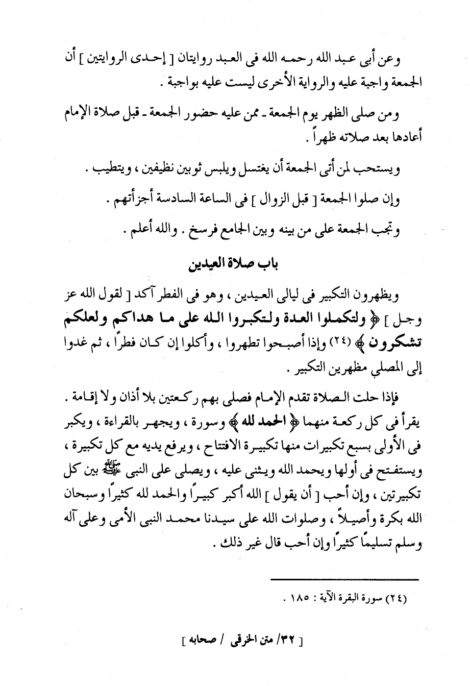 فإذا حلت الصلاة تقدم الإمام فصلى بهم ركعتين بلا آذان ولا إقامة يقرأ في كل ركعة منهما " الحمد لله" وسورة ويجهر بالقراءة ويكبر في الأولى بسبع تكبيرات منها تكبيرة الافتتاح ويرفع يديه مع كل تكبيرة ويستفتح في أولها ويحمد الله ويثني عليه ويصلي على النبي صلى الله عليه وسلم بين كل تكبيرتين وإن أحب قال الله أكبر كبيرا والحمد لله كثيرا وسبحان الله بكرة وأصيلا وصلوات الله على النبي عليه السلام وإن أحب قال غير ذلك.