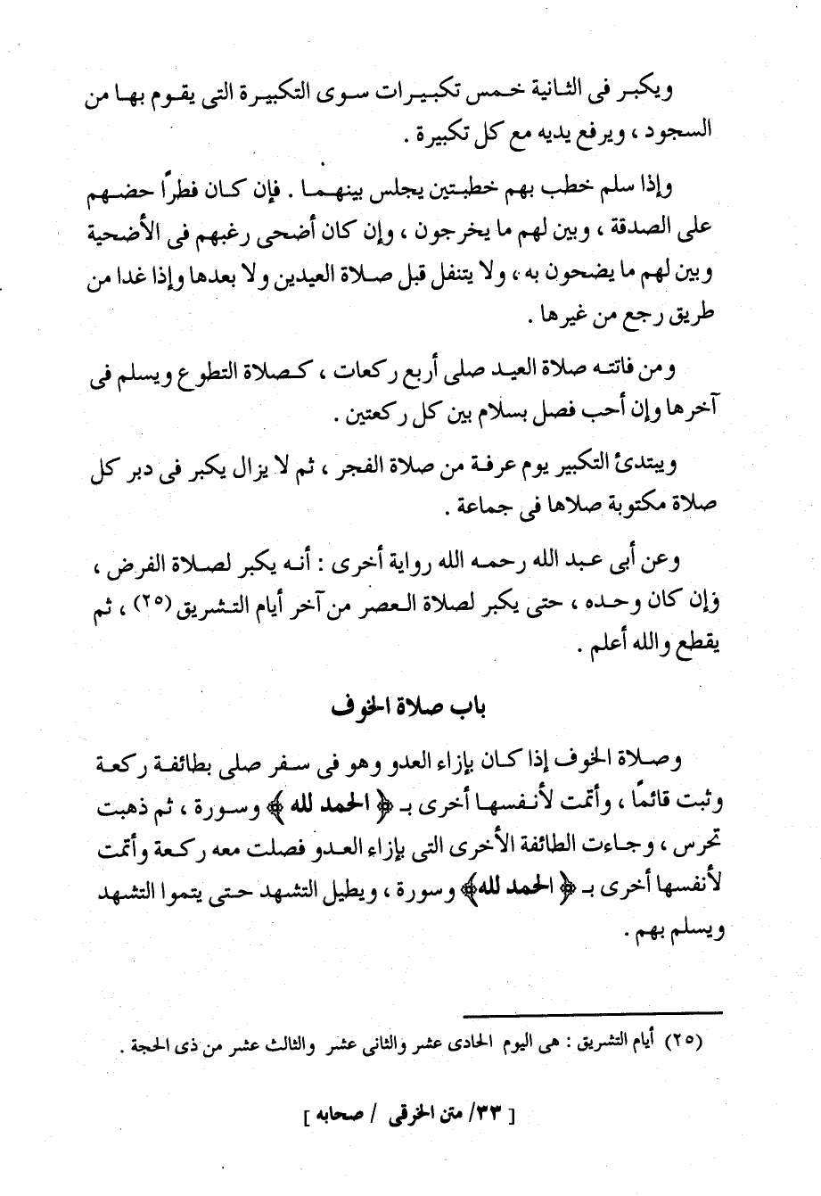 وصلاة الخوف إذا كان بإزاء العدو وهو في سفر صلى بطائفة ركعة وثبت قائما وأتمت لأنفسها أخرى ب "الحمد لله" وسورة ثم ذهبت تحرس وجاءت الطائفة الأخرى التي بإزاء العدو فصلت معه ركعة وأتمت لأنفسها أخرى ب "الحمد لله" وسورة ويطيل التشهد حتى يتموا التشهد ويسلم بهم.