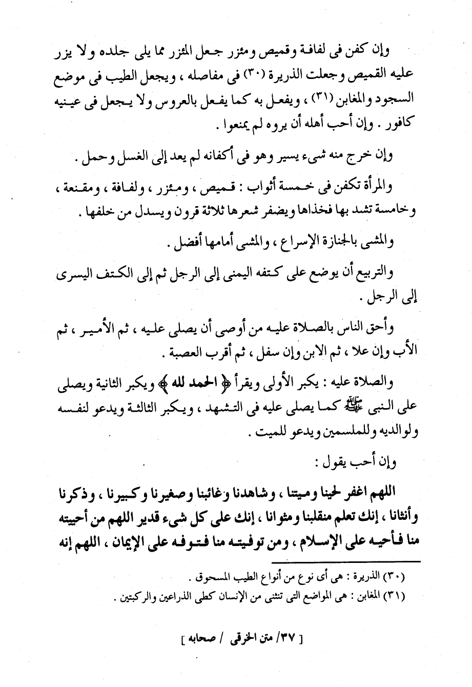 والمرأة تكفن في خمسة أثواب قميص ومئزر ولفافة ومقنعة وخامسة تشد بها فخذاها ويضفر شعرها ثلاثة قرون ويسدل من خلفها.