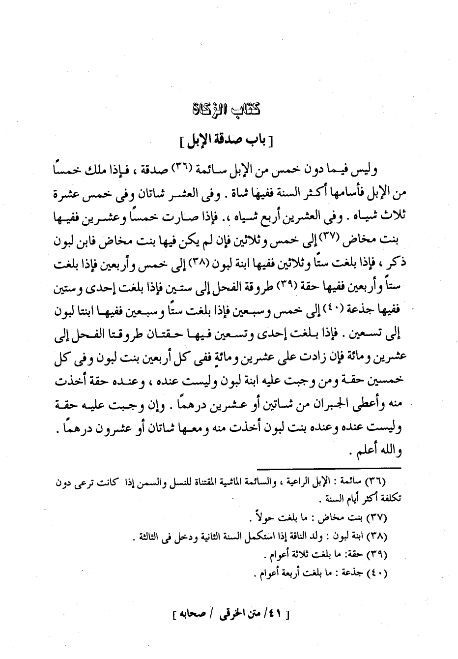 وليس فيما دون خمس من الإبل سائمة1 صدقة فإذا ملك خمسا من الإبل فأسامها أكثر السنة ففيها شاة وفي العشر شاتان وفي خمس عشرة ثلاث شياه وفي العشرين أربع شياه فإذا صارت خمسا وعشرين ففيها بنت مخاض2 إلى خمس وثلاثين فإن لم يكن فيها بنت مخاض فابن لبون ذكر فإذا بلغت ستا وثلاثين ففيها ابنة لبون3 إلى خمس وأربعين فإذا بلغت ستا وأربعين ففيها حقة4 طروقة الفحل إلى ستين فإذا بلغت إحدى وستين ففيها جذعة5 إلى خمس وسبعين فإذا بلغت ستا وسبعين ففيها ابنتا لبون إلى تسعين فإذا بلغت إحدى وتسعين ففيها حقتان طروقتا الفحل إلى عشرين ومائة وهذا كله مجمع عليه فإن زادت على عشرين ومائة ففي كل أربعين بنت لبون وفي كل خمسين حقة ومن وجبت عليه ابنة لبون وليست عنده وعنده حقة أخذت منه وأعطي الجبران من شاتين أو عشرين درهما وإن وجبت عليه حقة وليست عنده وعنده بنت لبون أخذت منه ومعها شاتان أو عشرون درهما والله أعلم.