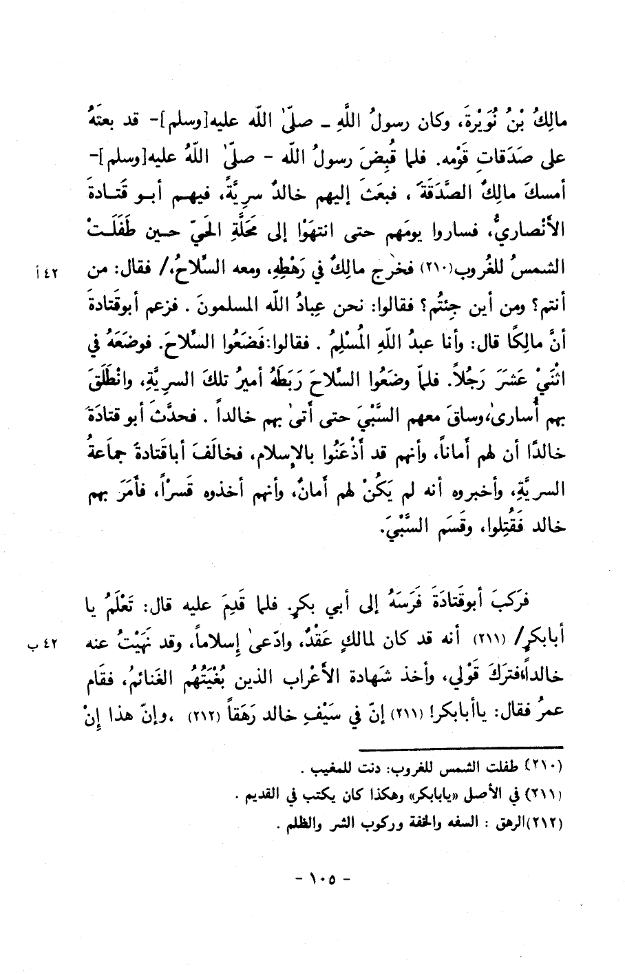 فركب أبو قتادة فرسه إلى أبي بكرٍ. فلما قدم عليه قال: تعلم يا أبا بكرٍ/ أنه قد كان لمالكٍ عقدٌ, وادعى إسلاماً, وقد نهيت عنه خالداً, فترك قولي, وأخذ شهادة الأعراب الذين بغيتهم الغنائم, فقام عمر فقال: يا أبا بكر! إن في سيف خالد رهقاً, وإن هذا إن