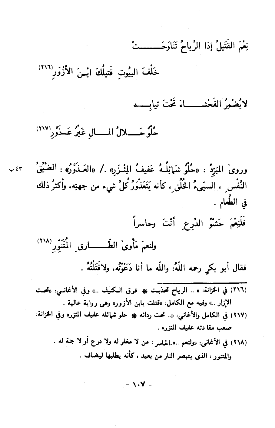 وروى المبرد: ((حلوٌ شمائله عفيف المئزر))./ ((العذور)): الضيق النفس، السيء الخلق، كأنه يتعذور كل شيء من جهته، وأكثر ذلك في الطعام.