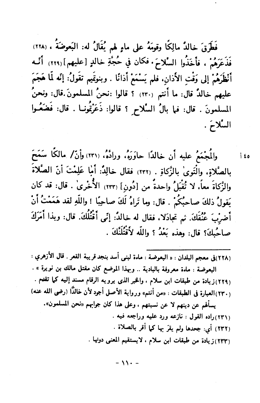 والمجمع عليه أن خالداً حاوره, وراده, وأن/ مالكاً سمح بالصلاة, والتوى بالزكاة. فقال خالدٌ: أما علمت أن الصلاة والزكاة معاً, لا تقبل واحدةٌ من [دون] الأخرى. قال: قد كان يقول ذلك صاحبكم. قال: وما تراه لك صاحباً! والله لقد هممت أن أضرب عنقك. ثم تجادلا, فقال له خالدٌ: إني أقتلك. قال: وبذا أمرك صاحبك؟ قال: وهذه بعد؟ والله لأقتلنك.