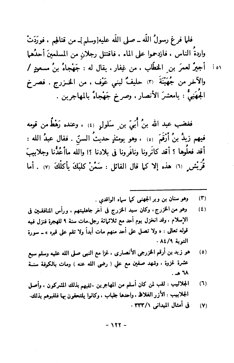 فغضب عبد الله بن أبي بن سلولٍ, وعنده رهطٌ من قومه فيهم زيد بن أرقم, وهو يومئذٍ حديث السن. فقال عبد الله: أقد فعلوها؟ أقد كاثرونا ونافرونا في بلادنا؟! والله ما أعدنا وجلابيب قريشٍ هذه إلا كما قال القائل: سمن كلبك يأكلك. أما