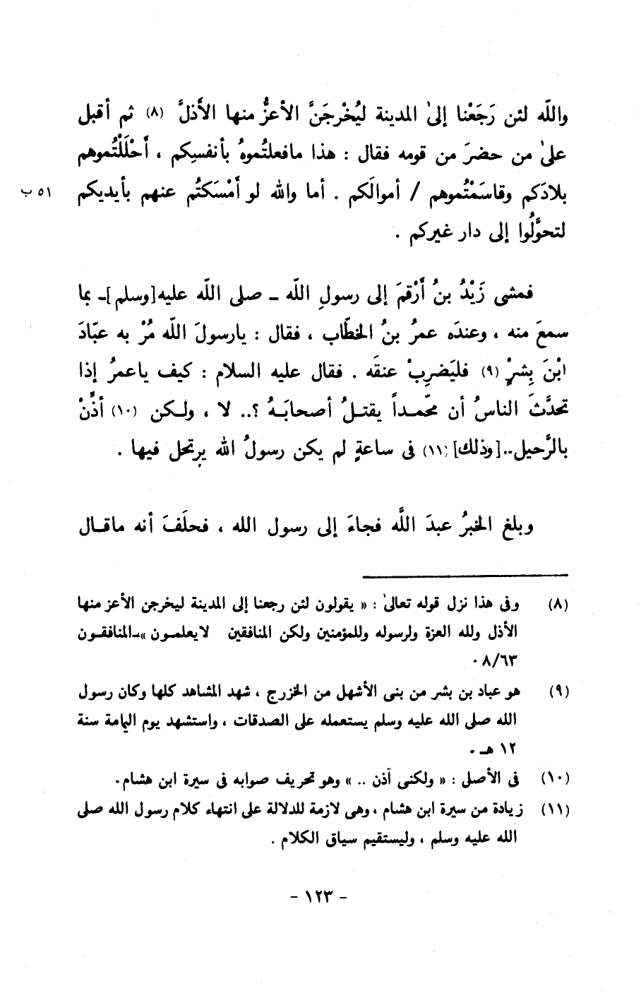 فمشى زيد بن أرقم إلى رسول الله - صلى الله عليه وسلم - بما سمع منه, وعنده عمر بن الخطاب, فقال: يا رسول الله مر به عباد ابن بشرٍ فليضرب عنقه. فقال عليه السلام: كيف يا عمر إذا تحدث الناس أن محمداً يقتل أصحابه؟.. لا, ولكن أذن بالرحيل.. [وذلك] في ساعةٍ لم يكن رسول الله يرتحل فيها.