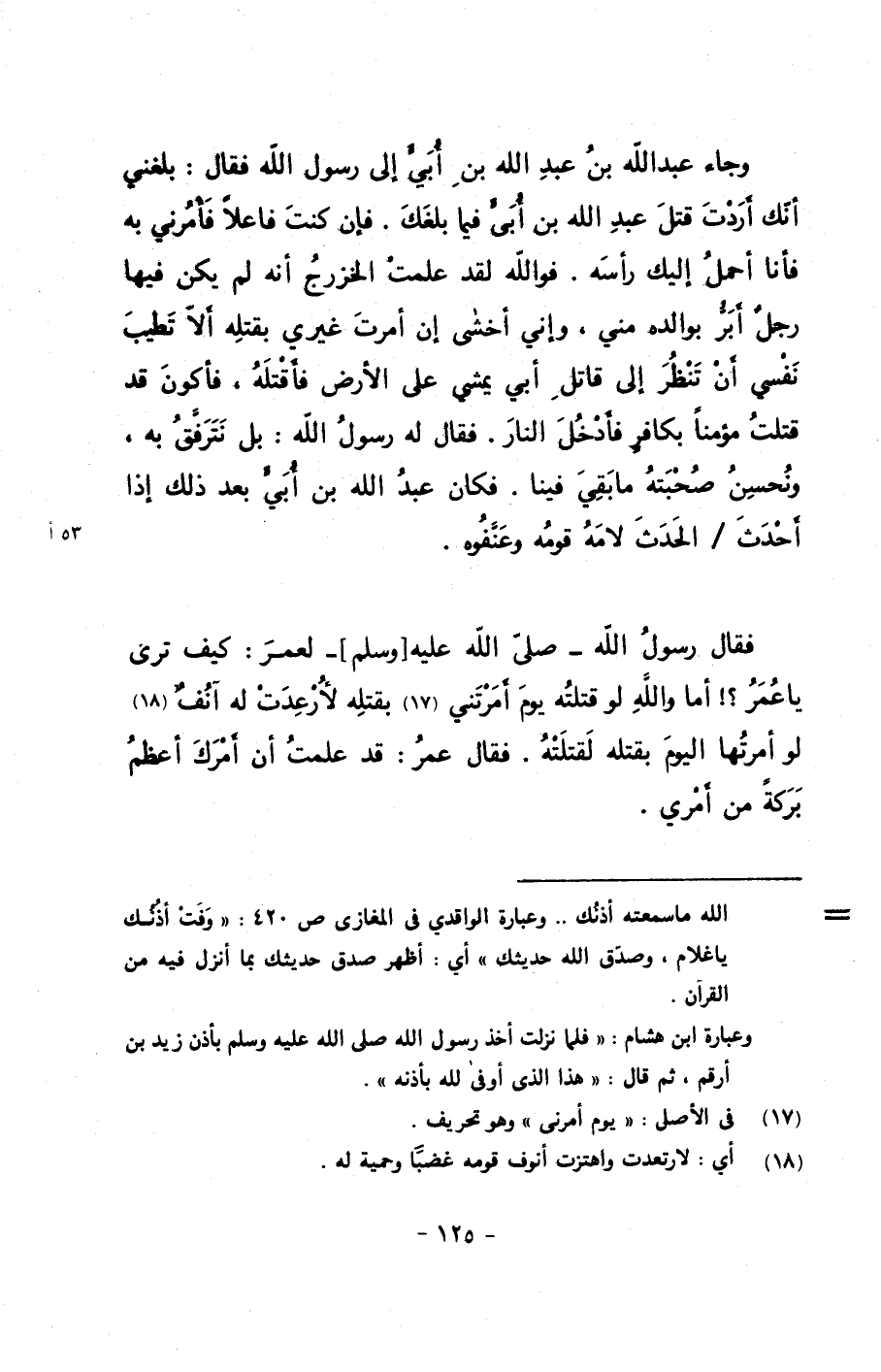 وجاء عبد الله بن عبد الله بن أبي إلى رسول الله فقال: بلغني أنك أردت قتل عبد الله بن أبي فيما بلغك. فإن كنت فاعلاً فأمرني به فأنا أحمل إليك رأسه. فوالله لقد علمت الخزرج أنه لم يكن فيها رجلٌ أبر بوالده مني, وإني أخشى إن أمرت غيري بقتله ألا تطيب نفسي أن تنظر إلى قاتل أبي يمشي على الأرض فأقتله, فأكون قد قتلت مؤمناً بكافرٍ فأدخل النار. فقال له رسول الله: بل نترفق به, ونحسن صحبته ما بقي فينا. فكان عبد الله بن أبي بعد ذلك إذا أحدث/ الحدث لامه قومه وعنفوه.