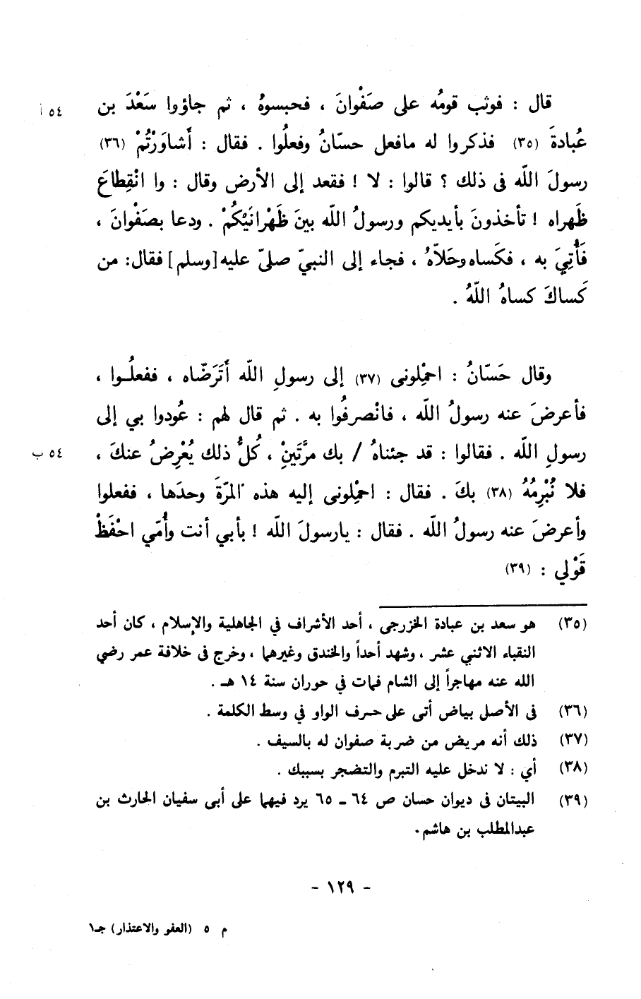 قال: فوثب قومه على صفوان, فحبسوه, ثم جاؤوا سعد بن عبادة فذكروا له ما فعل حسان وفعلوا. فقال: أشاورتم رسول الله في ذلك؟ قالوا: لا! فقعد إلى الأرض وقال: وا انقطاع ظهراه! تأخذون بأيديكم ورسول الله بين ظهرانيكم. ودعا بصفوان, فأتي به, فكساه وحلاه, فجاء إلى النبي صلى الله عليه وسلم فقال: من كساك كساه الله.
