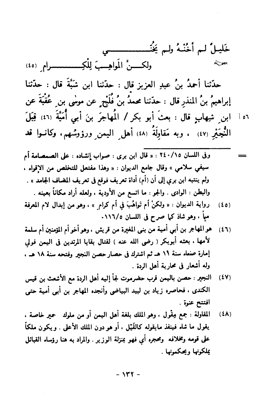 حدثنا أحمد بن عبد العزيز قال: حدثنا ابن شبة قال: حدثنا إبراهيم بن المنذر قال: حدثنا محمد بن فليحٍ عن موسى بن عقبة عن ابن شهابٍ قال: بعث أبو بكر/ المهاجر بن أبي أمية قبل النجير، وبه مقاولة أهل اليمن ورؤوسهم، وكانوا قد