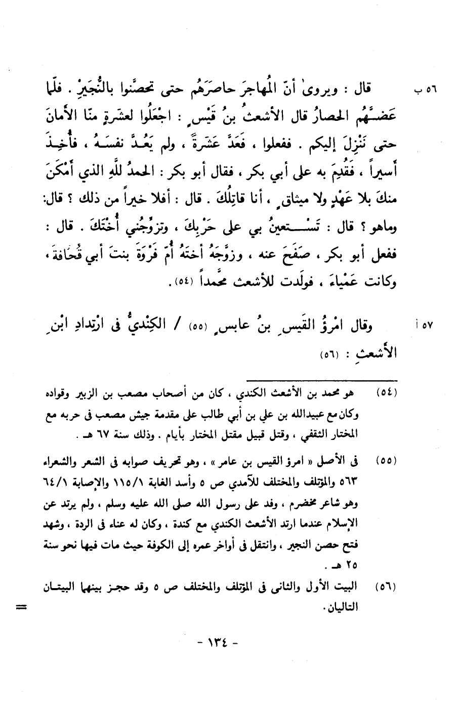 قال: ويروى أن المهاجر حاصرهم حتى تحصنوا بالنجير. فلما عضهم الحصار قال الأشعث بن قيسٍ: اجعلوا لعشرةٍ منا الأمان حتى ننزل إليكم. ففعلوا، فعد عشرةً، ولم يعد نفسه، فأخذ أسيراً، فقدم به على أبي بكر، فقال أبو بكر: الحمد لله الذي أمكن منك بلا عهدٍ ولا ميثاقٍ، أنا قاتلك. قال: أفلا خيراً من ذلك؟ قال: وما هو؟ قال: تستعين بي على حربك، وتزوجني أختك. قال: ففعل أبو بكر، صفح عنه، وزوجه أخته أم فروة بنت أبي قحافة، وكانت عمياء، فولدت للأشعث محمداً.