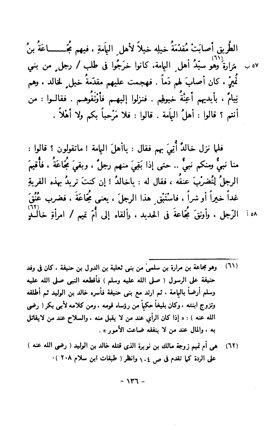 الطريق أصابت مقدمة خيله خيلاً لأهل اليمامة، فيهم مجاعة بن مرارة وهو سيد أهل اليمامة، كانوا خرجوا في طلب/ رجلٍ من بني نميرٍ، كان أصاب لهم دماً. فهجمت عليهم مقدمة خيلٍ لخالد، وهم نيامٌ، بأيديهم أعنة خيولهم. فنزلوا إليهم فأوثقوهم. فقالوا: من أنتم؟ قالوا: أهل اليمامة. قالوا: فلا مرحباً بكم ولا أهلاً.
