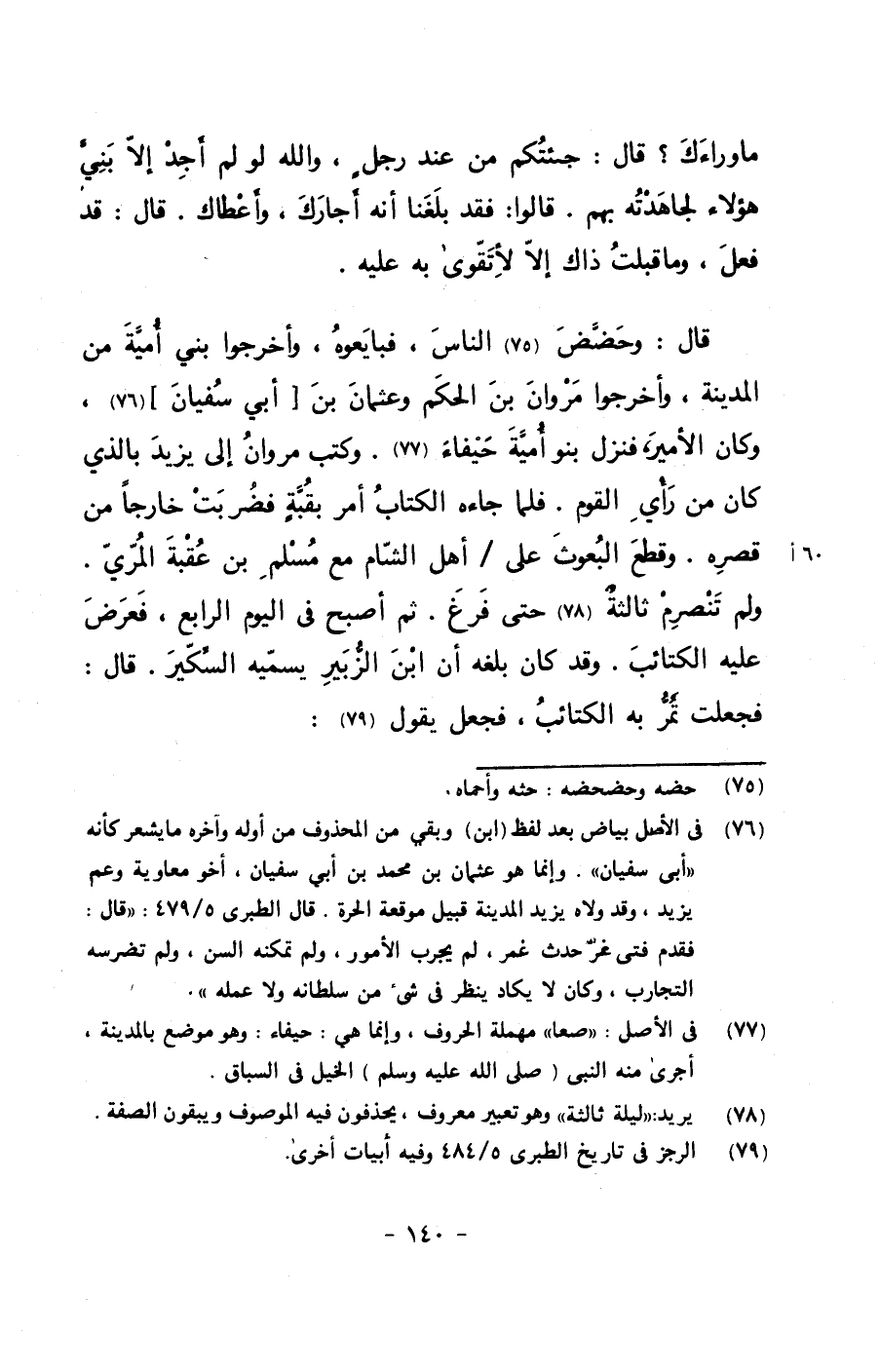 قال: وحضض الناس، فبايعوه، وأخرجوا بني أمية من المدينة، وأخرجوا مروان بن الحكم وعثمان بن [أبي سفيان]، وكان الأمير، فنزل بنو أمية حيفاء. وكتب مروان إلى يزيد بالذي كان من رأي القوم. فلما جاءه الكتاب أمر بقبةٍ فضربت خارجاً من قصره. وقطع البعوث على/ أهل الشام مع مسلم بن عقبة المري. ولم تنصرم ثالثةٌ حتى فرغ. ثم أصبح في اليوم الرابع، فعرض عليه الكتائب. وقد كان بلغه أن ابن الزبير يسميه السكير. قال: فجعلت تمر به الكتائب، فجعل يقول: