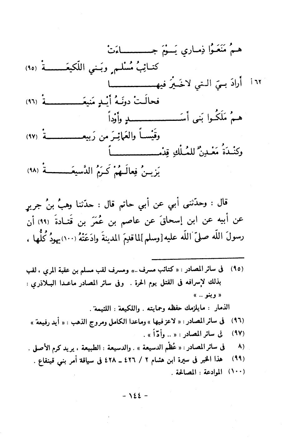 قال: وحدثني أبي عن أبي حاتم قال: حدثنا وهب بن جريرٍ عن أبيه عن ابن إسحاق عن عاصم بن عمر بن قتادة أن رسول الله صلى الله عليه وسلم لما قدم المدينة وادعته يهود كلها,
