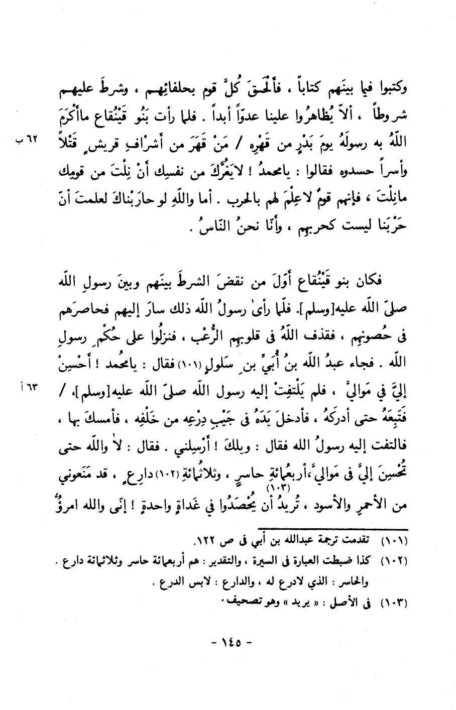 فكان بنو قينقاع أول من نقض الشرط بينهم وبين رسول الله صلى الله عليه وسلم . فلما رأى رسول الله ذلك سار إليهم فحاصرهم في حصونهم, فقذف الله في قلوبهم الرعب, فنزلوا على حكم رسول الله. فجاء عبد الله بن أبي بن سلولٍ فقال: يا محمد! أحسن إلي في موالي, فلم يلتفت إليه رسول الله صلى الله عليه وسلم , / فتبعه حتى أدركه, فأدخل يده في جيب درعه من خلفه, فأمسك بها, فالتفت إليه رسول الله فقال: ويلك! أرسلني. فقال: لا والله حتى تحسن إلي في موالي, أربعمائة حاسرٍ, وثلاثمائة دارعٍ, قد منعوني من الأحمر والأسود, تريد أن يحصدوا في غداةٍ واحدةٍ! إني والله امرؤٌ