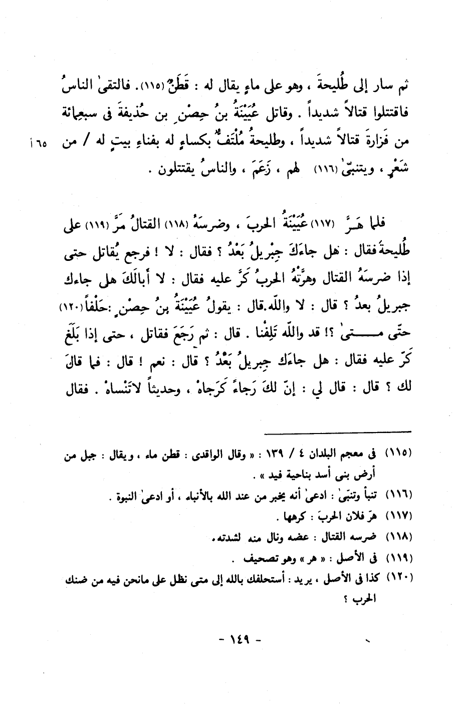 ثم سار إلى طليحة، وهو على ماءٍ يقال له: قطنٌ. فالتقى الناس فاقتتلوا قتالاً شديداً، وقاتل عيينة بن حصن بن حذيفة في سبعمائة من فزارة قتالاً شديداً، وطليحة ملتفٌ بكساءٍ له بفناء بيتٍ له/ من شعرٍ، ويتنبى لهم، زعم، والناس يقتتلون.