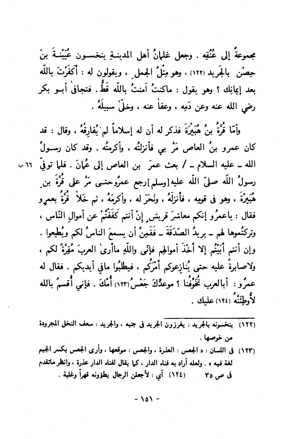 وأما قرة بن هبيرة فذكر له أن له إسلاماً لم يفارقه، وقال: قد كان عمرو بن العاص مر بي فأنزلته، وأكرمته. وقد كان رسول الله - عليه السلام -/ بعث عمرو بن العاص إلى عمان. فلما توفي رسول الله صلى الله عليه وسلم رجع عمرٌو حتى مر على قرة بن هبيرة، وهو في قومه، فأنزله، ونحر له، وأكرمه، ثم خلا قرة بعمرٍو فقال: يا عمرو إنكم معاشر قريشٍ إن أنتم كففتم عن أموال الناس، وتركتموها لهم –يريد الصدقة- فقمنٌ أن يسمع الناس لكم ويطيعوا. وإن أنتم أبيتم إلا أخذ أموالهم فإني والله ما أرى العرب مقرةً لكم، ولا صابرةً عليه حتى ينازعوكم أمركم، فيطلبوا ما في أيديكم. فقال له عمرٌو: أبالعرب تخوفنا؟ موعدك جعس أمك. فإني أقسم بالله لأوطئنه عليك.