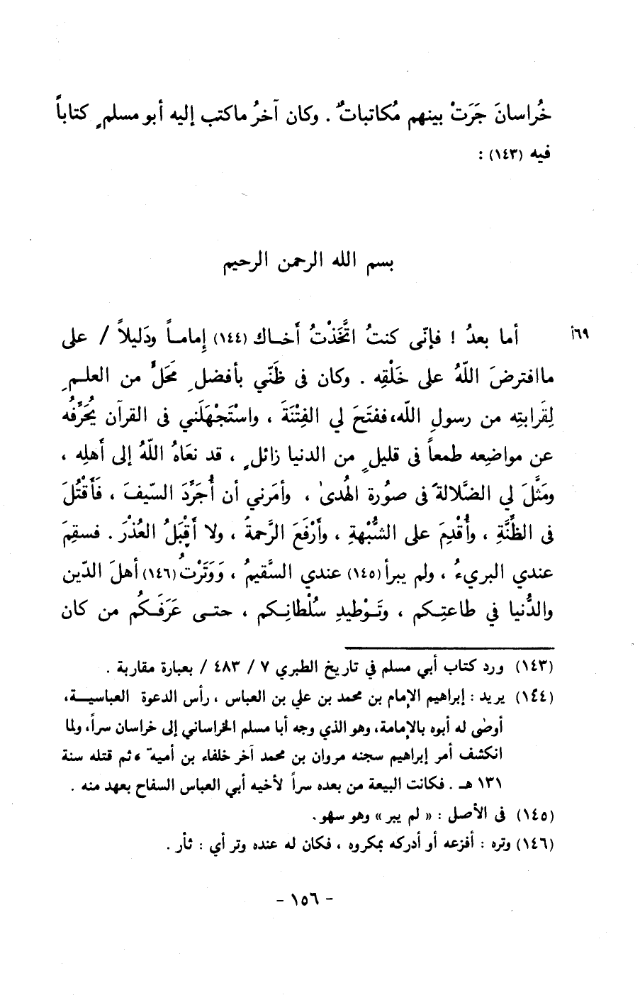 ((أما بعد! فإني كنت اتخذت أخاك إماماً ودليلاً/ على ما افترض الله على خلقه. وكان في ظني بأفضل محلٍ من العلم لقرابته من رسول الله, ففتح لي الفتنة, واستجهلني في القرآن يحرفه عن مواضعه طمعاً في قليلٍ من الدنيا زائلٍ, قد نعاه الله إلى أهله, ومثل لي الضلالة في صورة الهدى, وأمرني أن أجرد السيف, فأقتل في الظنة, وأقدم على الشبهة, وأرفع الرحمة, ولا أقبل العذر. فسقم عندي البريء, ولم يبرأ عندي السقيم, ووترت أهل الدين والدنيا في طاعتكم, وتوطيد سلطانكم, حتى عرفكم من كان