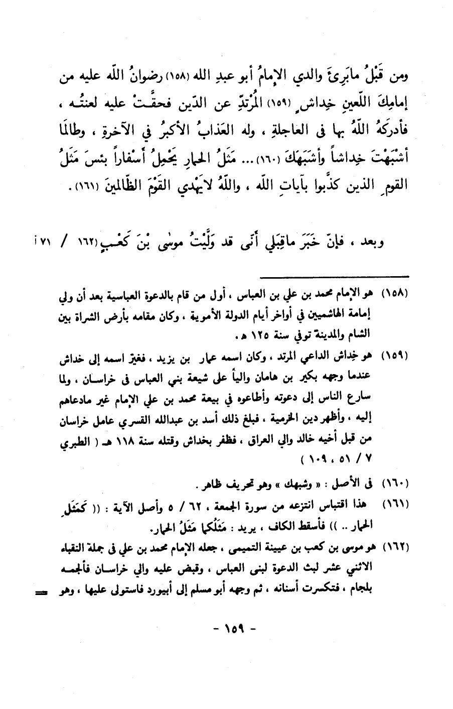 ومن قبل ما برئ والدي الإمام أبو عبد الله رضوان الله عليه من إمامك اللعين خداشٍ المرتد عن الدين فحقت عليه لعنته, فأدركه الله بها في العاجلة, وله العذاب الأكبر في الآخرة, وطالما أشبهت خداشاً وأشبهك.. .. مثل الحمار يحمل أسفاراً بئس مثل القوم الذين كذبوا بآيات الله, والله لا يهدي القوم الظالمين.