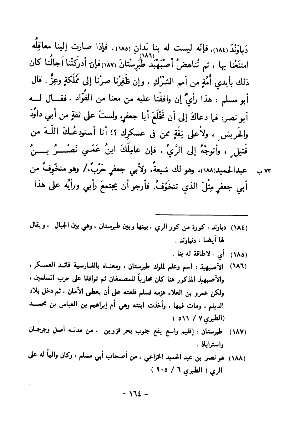 دباوند، فإنه ليست له بنا يدان. فإذا صارت إلينا معاقله امتنعنا بها، ثم نناهض أصبهبذ طبرستان فإن أدركتنا آجالنا كان ذلك بأيدي أمةٍ من أمم الشرك، وإن ظفرنا صرنا إلى مملكةٍ وعزٍ. قال أبو مسلم: هذا رأيٌ إن وافقنا عليه من معنا من القواد. فقال له أبو نصر: فما دعاك إلى أن تخلع أبا جعفرٍ، ولست على ثقةٍ من أبي داود والحريش، ولا على ثقةٍ ممن في عسكرك؟! أنا أستودعك الله من قتيلٍ، وأتوجه إلى الري، فإن عاملك ابن عمي نصر بن عبد الحميد، وهو لك شيعةٌ، ولأبي جعفرٍ حربٌ، / وهو متخوفٌ من أبي جعفرٍ مثل الذي تتخوف. فأرجو أن يجتمع رأيي ورأيه على هذا