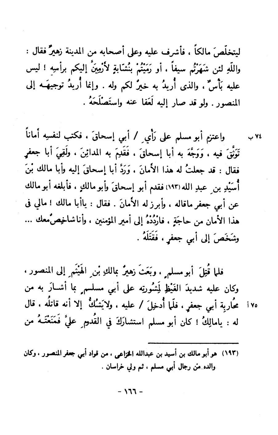 واعتزم أبو مسلم على رأي/ أبي إسحاق، فكتب لنفسه أماناً توثق فيه، ووجه به أبا إسحاق، فقدم به المدائن، ولقي أبا جعفرٍ فقال: قد جعلت له هذا الأمان، ورد أبا إسحاق إليه وأبا مالك بن أسيد بن عبد الله فقدم أبو إسحاق وأبو مالكٍ، فأبلغه أبو مالك عن أبي جعفر ما قاله، وأبرز له الأمان. فقال: يا أبا مالك! ما لي في هذا الأمان من حاجةٍ، فاردده إلى أمير المؤمنين، وأنا شاخصٌ معك.. .. وشخص إلى أبي جعفرٍ، فقتله.