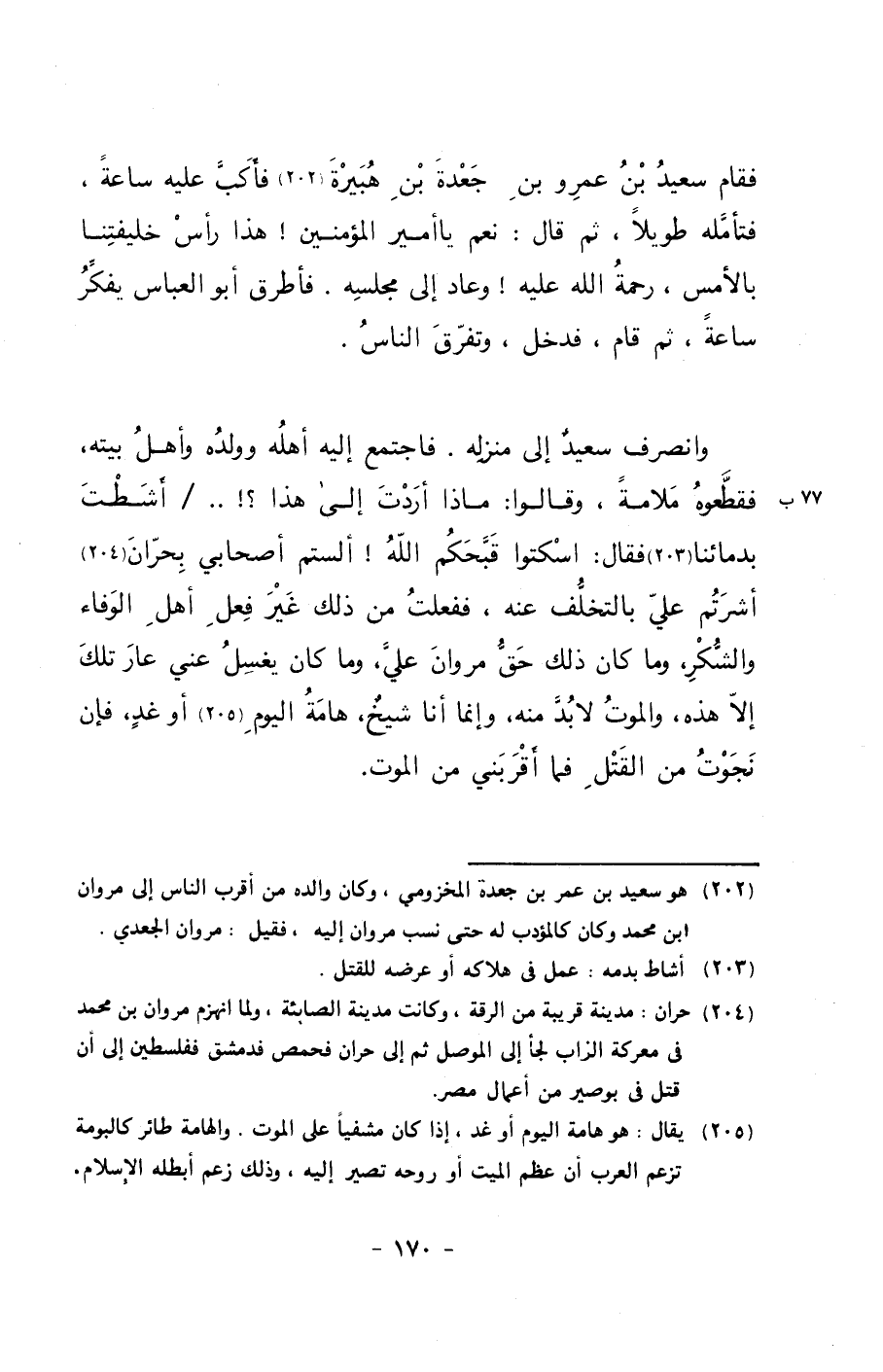 فقام سعيد بن عمرو بن جعدة بن هبيرة فأكب عليه ساعةً، فتأمله طويلاً، ثم قال: نعم يا أمير المؤمنين! هذا رأس خليفتنا بالأمس، رحمة الله عليه! وعاد إلى مجلسه. فأطرق أبو العباس يفكر ساعةً، ثم قام، فدخل، وتفرق الناس.