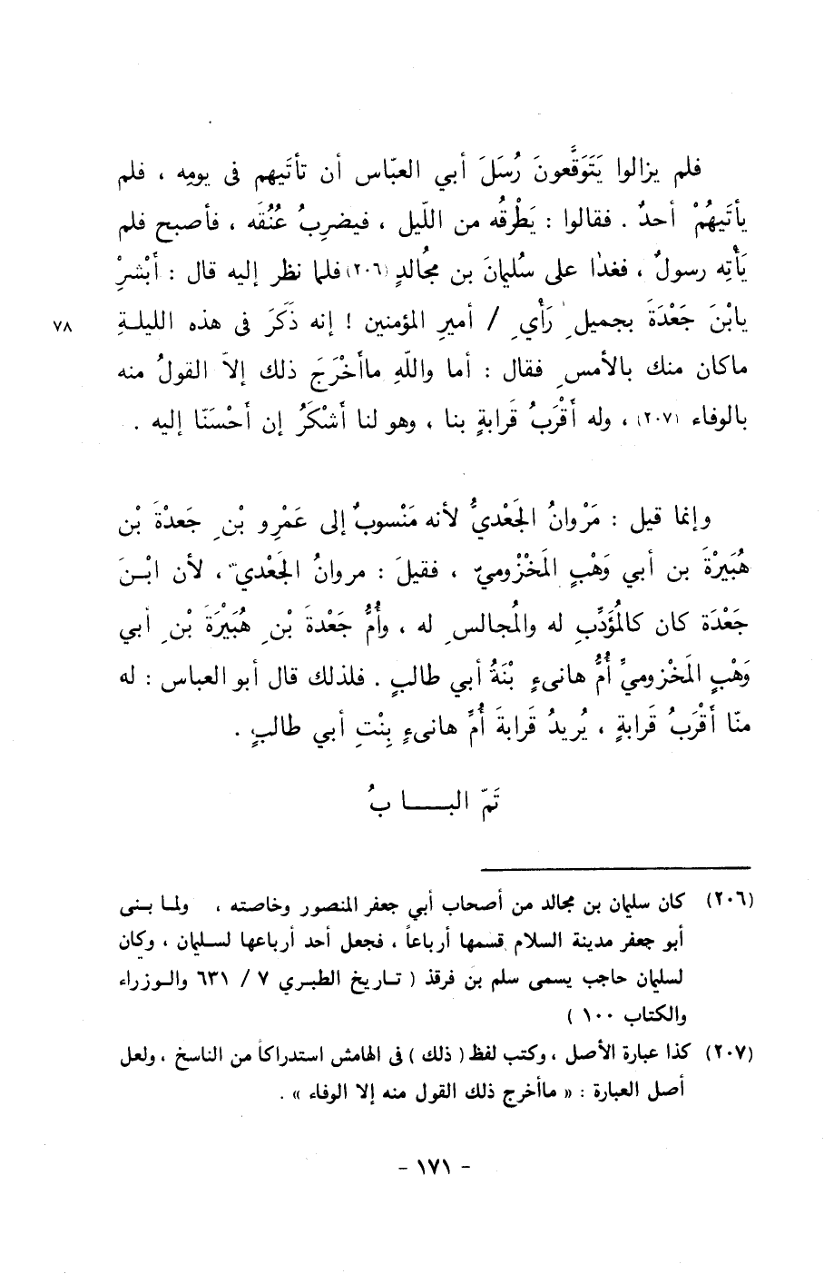 فلم يزالوا يتوقعون رسل أبي العباس أن تأتيهم في يومه, فلم يأتيهم أحدٌ. فقالوا: يطرقه من الليل, فيضرب عنقه, فأصبح فلم يأته رسولٌ, فغدا على سليمان بن مجالدٍ فلما نظر إليه قال: أبشر يا بن جعدة بجميل رأي/ أمير المؤمنين!إنه ذكر في هذه الليلة ما كان منك بالأمس فقال: أما والله ما أخرج ذلك إلا القول منه بالوفاء, وله أقرب قرابةٍ بنا, وهو لنا أشكر إن أحسنا إليه.