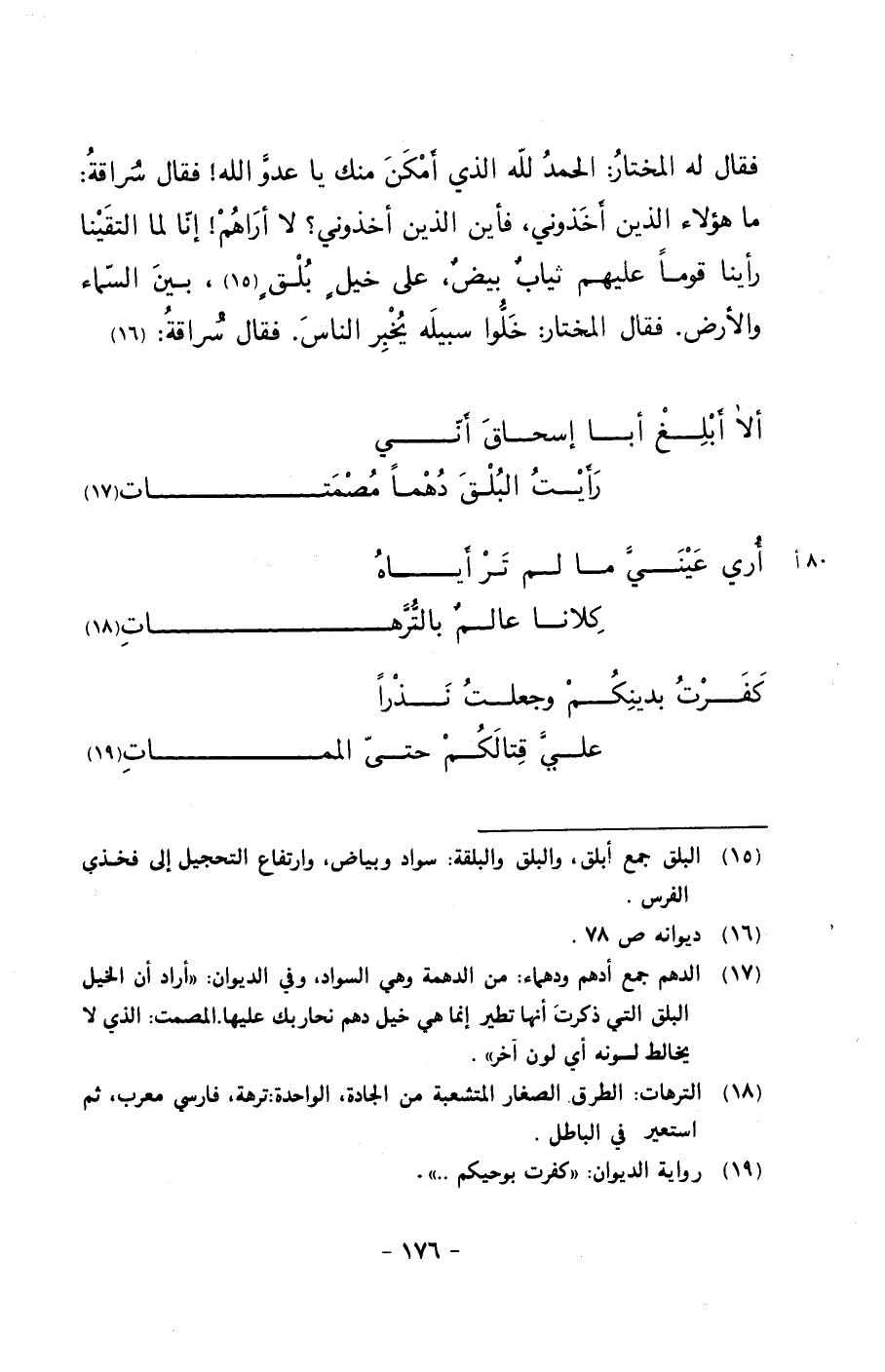 فقال له المختار: الحمد لله الذي أمكن منك يا عدو الله! فقال سراقة: ما هؤلاء الذين أخذوني, فأين الذين أخذوني؟ لا أراهم! إنا لما التقينا رأينا قوماً عليهم ثيابٌ بيضٌ, على خيلٍ بلقٍ, بين السماء والأرض. فقال المختار: خلوا سبيله يخبر الناس. فقال سراقة: