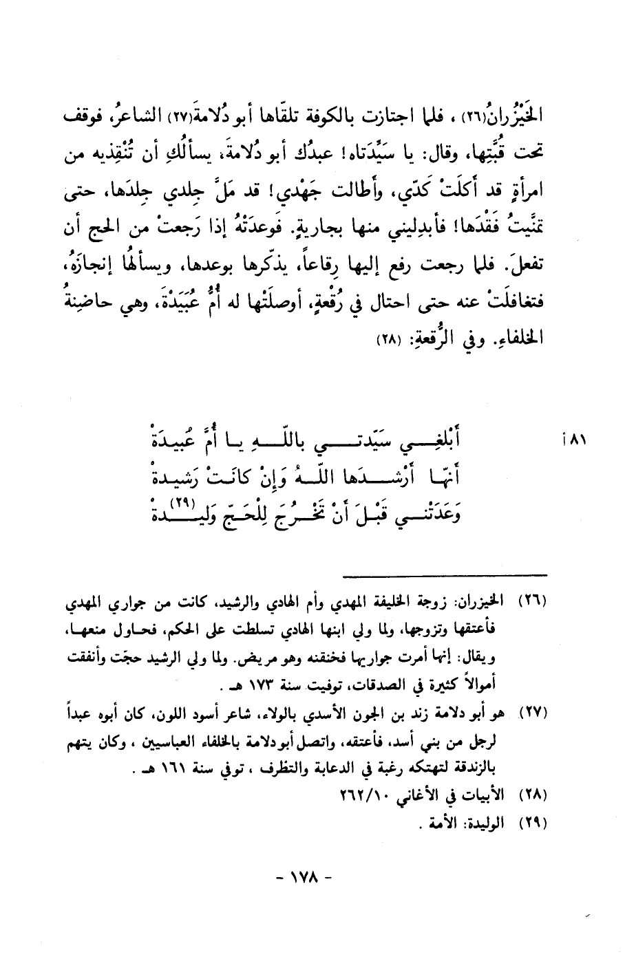 الخيزران, فلما اجتازت بالكوفة تلقاها أبو دلامة الشاعر، فوقف تحت قبتها، وقال: يا سيدتاه! عبدك أبو دلامة يسألك أن تنقذيه من امرأةٍ قد أكلت كدي, وأطالت جهدي! قد مل جلدي جلدها, حتى تمنيت فقدها! فأبدليني منها بجاريةٍ. فوعدته إذا رجعت من الحج أن تفعل. فلما رجعت رفع إليها رقاعاً, يذكرها بوعدها, ويسألها إنجازه, فتغافلت عنه حتى احتال في رقعةٍ, أوصلتها له أم عبيدة, وهي حاضنة الخلفاء. وفي الرقعة: