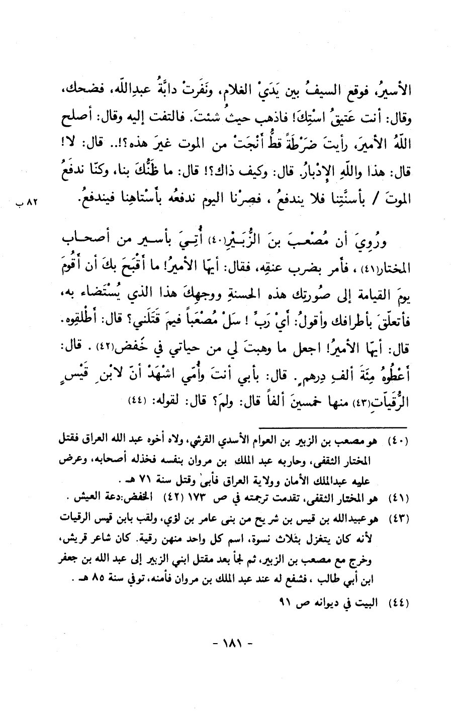 وروي أن مصعب بن الزبير أتي بأسير من أصحاب المختار, فأمر بضرب عنقه, فقال: أيها الأمير! ما أقبح بك أن أقوم يوم القيامة إلى صورتك هذه الحسنة ووجهك هذا الذي يستضاء به, فأتعلق بأطرافك وأقول: أي رب! سل مصعباً فيم قتلني؟ قال: أطلقوه. قال: أيها الأمير! اجعل ما وهبت لي من حياتي في خفض. قال: أعطوه مئة ألف درهمٍ. قال: بأبي أنت وأمي اشهد أن لابن قيسٍ الرقيات منها خمسين ألفاً قال: ولم؟ قال: لقوله: