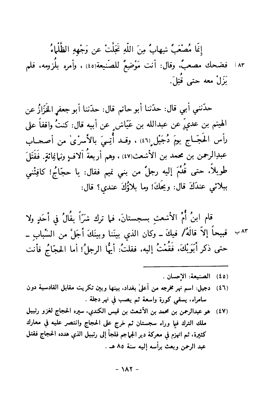 حدثني أبي قال: حدثنا أبو حاتم قال: حدثنا أبو جعفرٍ الخزاز عن الهيثم بن عديٍ عن عبد الله بن عياشٍ عن أبيه قال: كنت واقفاً على رأس الحجاج يوم دجيلٍ, وقد أتي بالأسرى من أصحاب عبد الرحمن بن محمد بن الأشعث, وهم أربعة آلافٍ وثمانمائةٍ. فقتل طويلاً, حتى قدم إليه رجلٌ من بني تميم فقال: يا حجاج! كافئني ببلائي عندك قال: ويحك! وما بلاؤك عندي؟ قال: