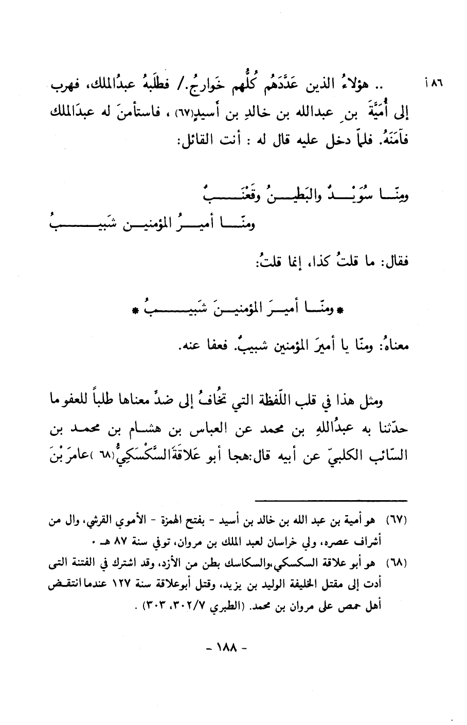 .. هؤلاء الذين عددهم كلهم خوارج./ فطلبه عبد الملك, فهرب إلى أمية بن عبد الله بن خالد بن أسيدٍ, فاستأمن له عبد الملك فآمنه. فلما دخل عليه قال له: أنت القائل: