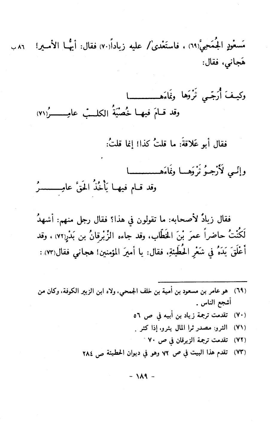 مسعودٍ الجمحي, فاستعدى/ عليه زياداً فقال: أيها الأمير! هجاني, فقال: