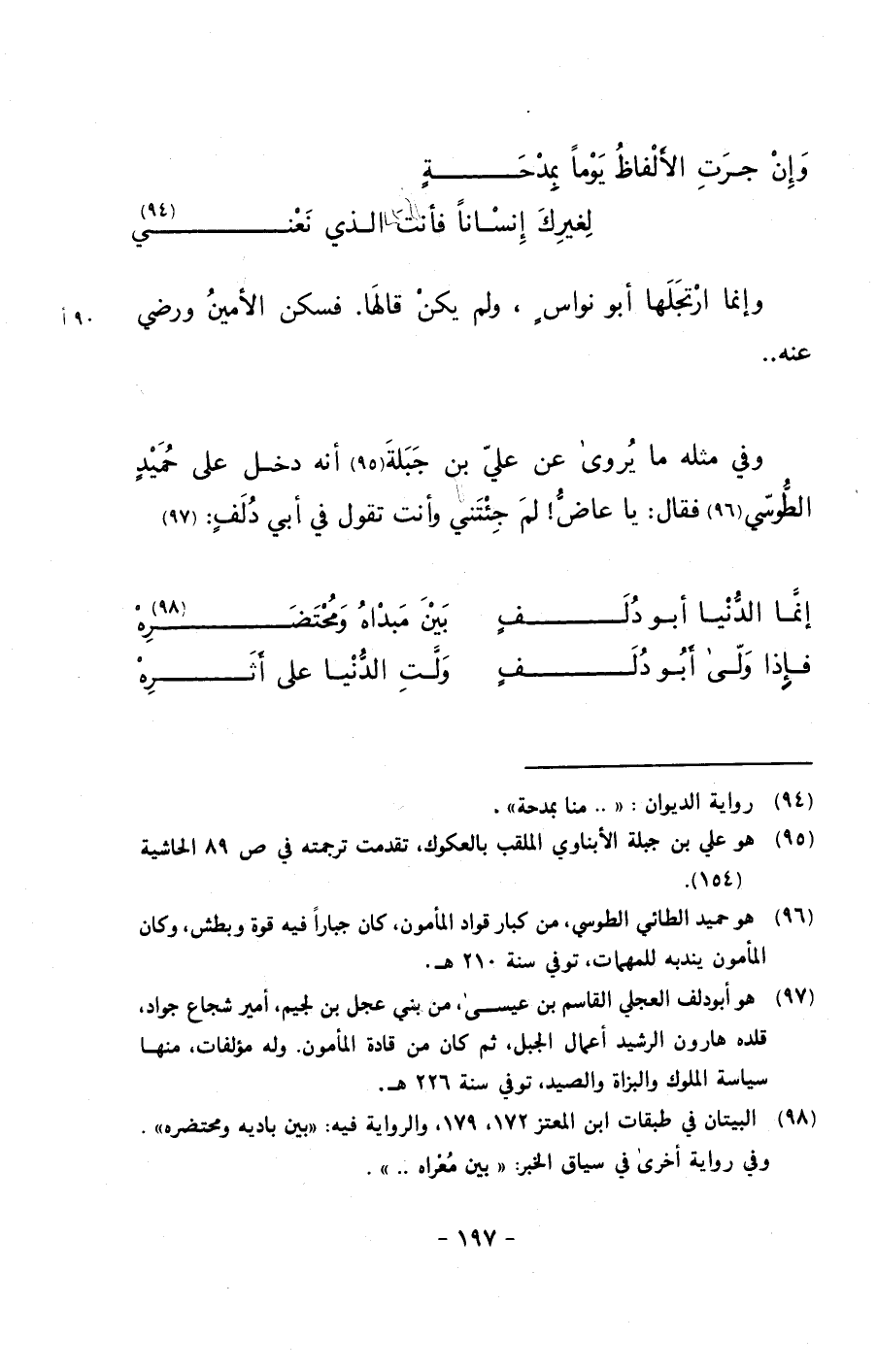 وفي مثله ما يروى عن علي بن جبلة أنه دخل على حميدٍ الطوسي فقال: يا عاض! لم جئتني وأنت تقول في أبي دلفٍ: