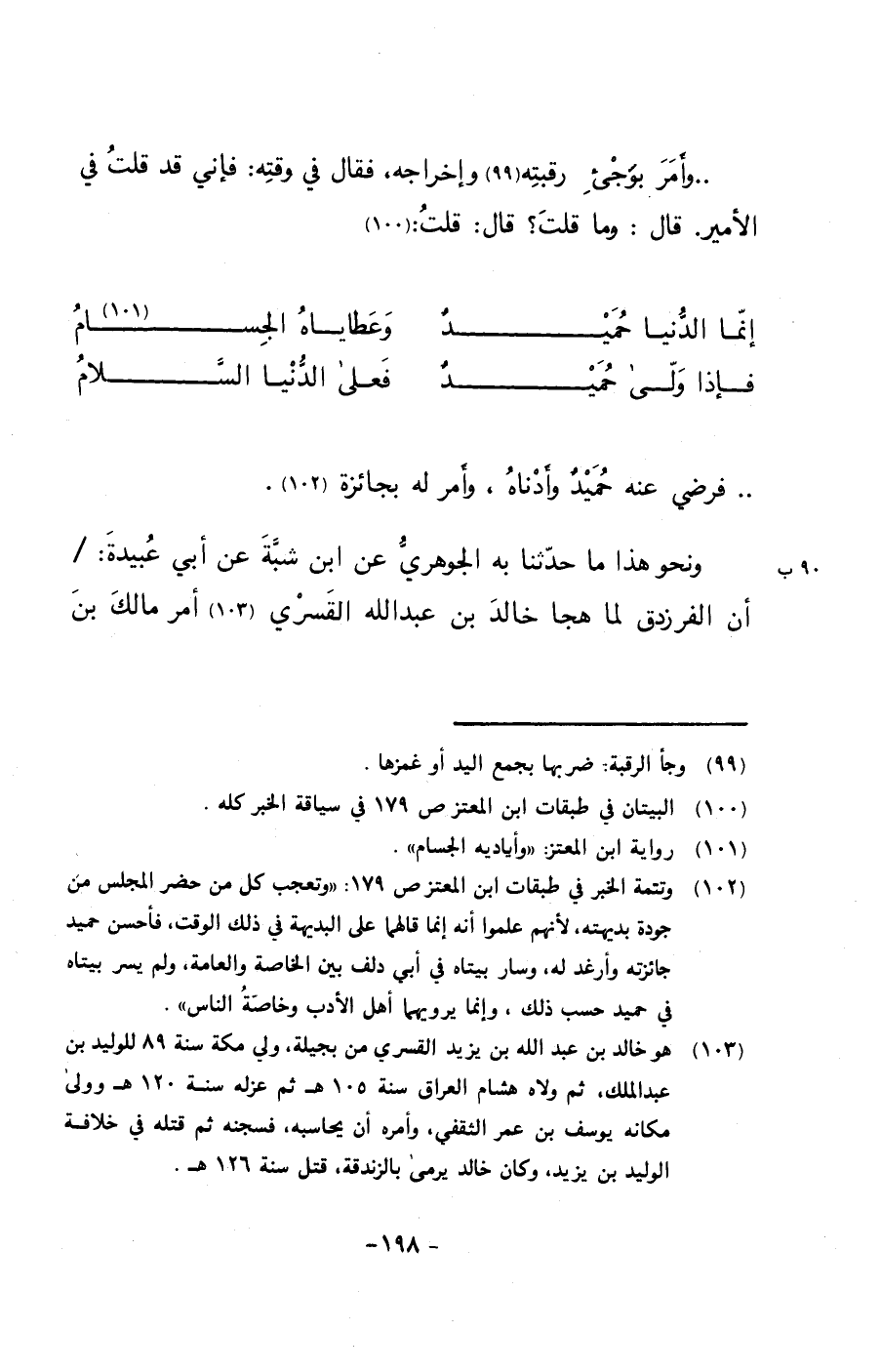 ونحو هذا ما حدثنا به الجوهري عن ابن شبة عن أبي عبيدة:/ أن الفرزدق لما هجا خالد بن عبد الله القسري أمر مالك بن