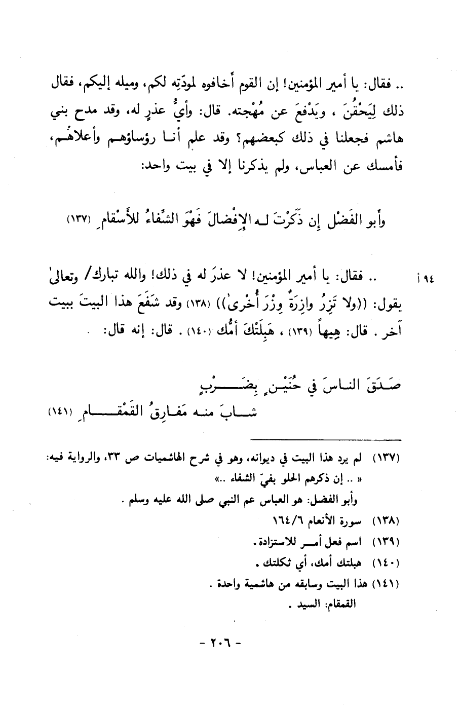 .. فقال: يا أمير المؤمنين! إن القوم أخافوه لمودته لكم, وميله إليكم, فقال ذلك ليحقن, ويدفع عن مهجته. قال: وأي عذرٍ له, وقد مدح بني هاشم فجعلنا في ذلك كبعضهم؟ وقد علم أنا رؤساؤهم وأعلاهم, فأمسك عن العباس, ولم يذكرنا إلا في بيت واحد: