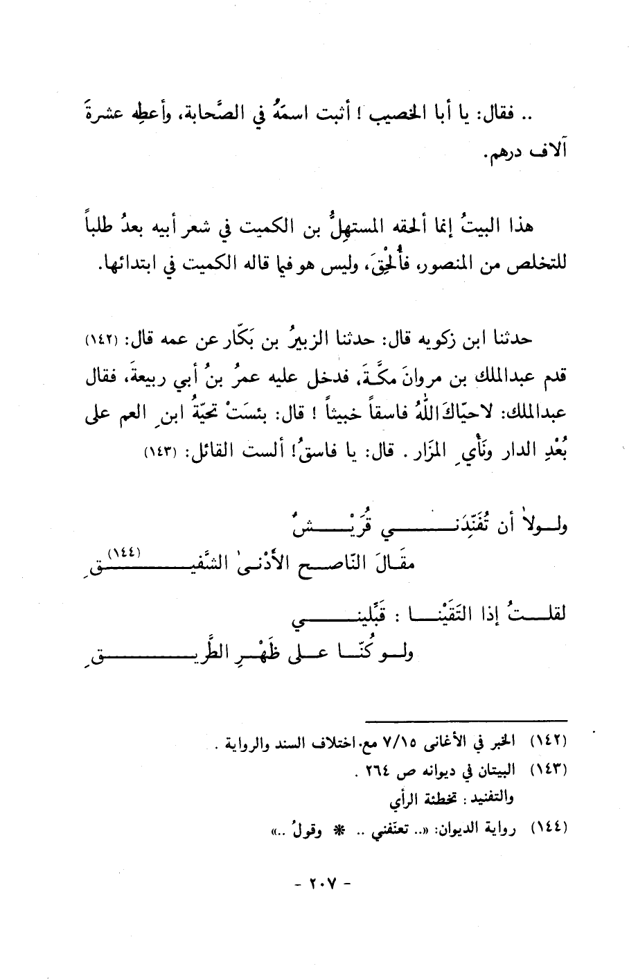 حدثنا ابن زكويه قال: حدثنا الزبير بن بكار عن عمه قال: قدم عبد الملك بن مروان مكة، فدخل عليه عمر بن أبي ربيعة، فقال عبد الملك: لا حياك الله فاسقاً خبيثاً! قال: بئست تحية ابن العم على بعد الدار ونأي المزار. قال: يا فاسق! ألست القائل: