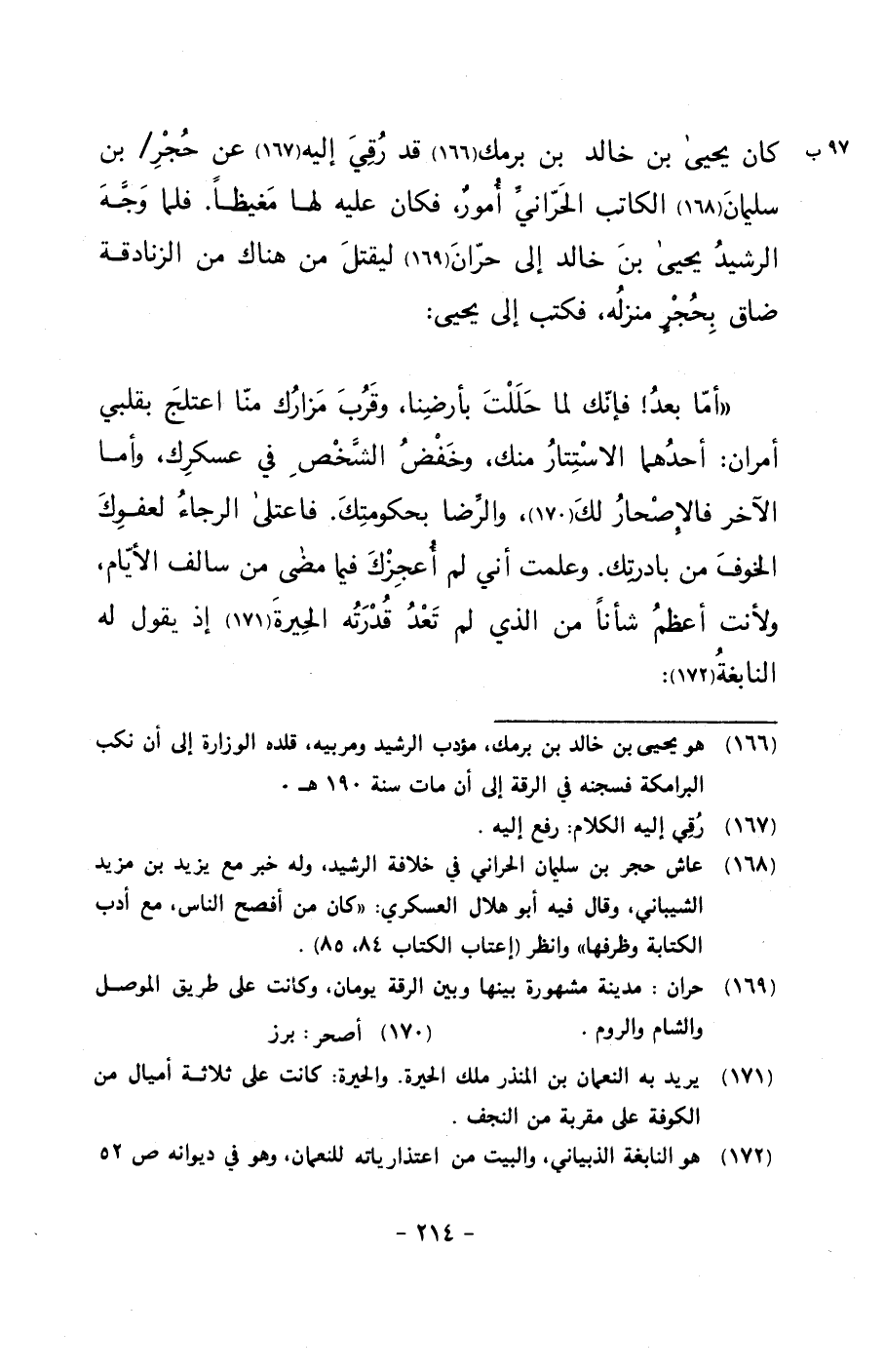 كان يحيى بن خالد بن برمك قد رقي إليه عن حجر/ بن سليمان الكاتب الحراني أمورٌ, فكان عليه لها مغيظاً. فلما وجه الرشيد يحيى بن خالد إلى حران ليقتل من هناك من الزنادقة ضاق بحجرٍ منزله, فكتب إلى يحيى: