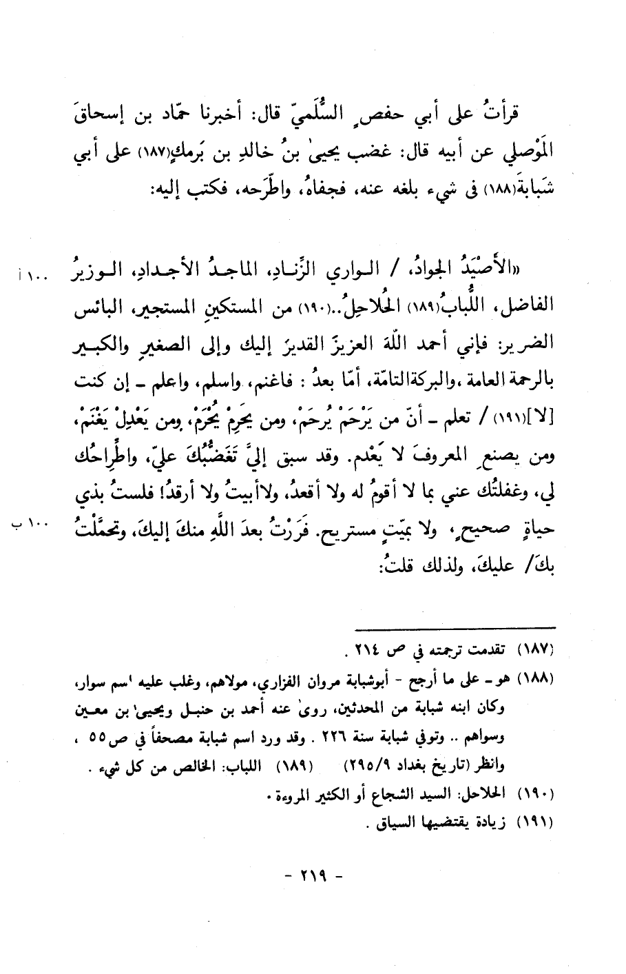 ((الأصيد الجواد، / الواري الزناد، الماجد الأجداد، الوزير الفاضل، اللباب الحلاحل.. من المستكين المستجير، البائس الضرير: فإني أحمد الله العزيز القدير إليك وإلى الصغير والكبير بالرحمة العامة، والبركة التامة، أما بعد: فاغنم، واسلم، واعلم –إن كنت [لا]/ تعلم- أن من يرحم يرحم، ومن يحرم يحرم، ومن يعدل يغنم، ومن يصنع المعروف لا يعدم. وقد سبق إلي تغضبك علي، واطراحك لي، وغفلتك عني بما لا أقوم له ولا أقعد، ولا أبيت ولا أرقد! فلست بذي حياةٍ صحيحٍ، ولا بميتٍ مستريح. فررت بعد الله منك إليك، وتحملت بك/ عليك، ولذلك قلت: