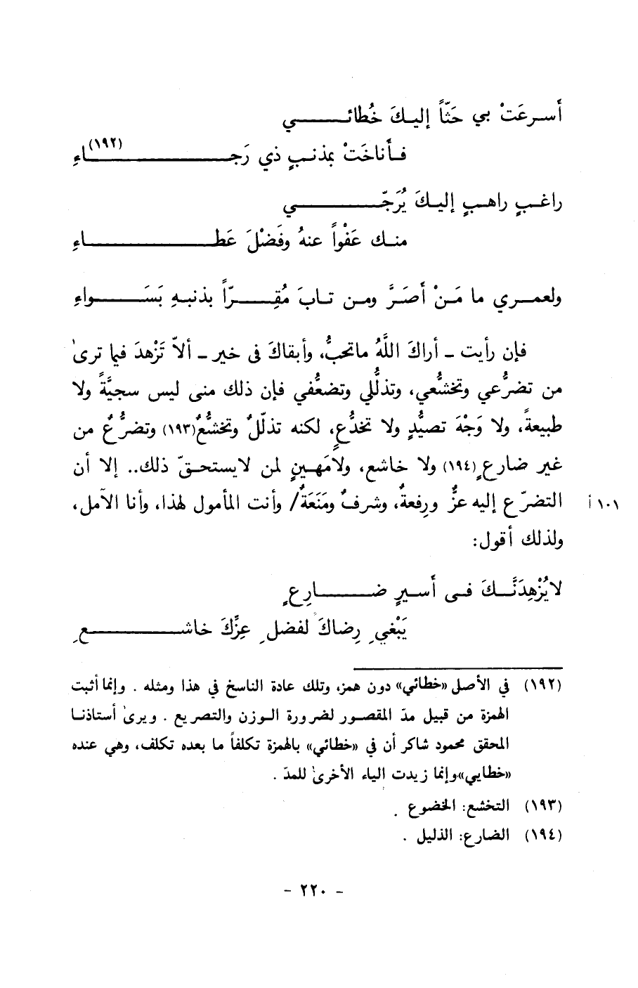 فإن رأيت –أراك الله ما تحب، وأبقاك في خير- ألا تزهد فيما ترى من تضرعي وتخشعي، وتذللي وتضعفي فإن ذلك مني ليس سجيةً ولا طبيعةً، ولا وجه تصيدٍ ولا تخدعٍ، لكنه تذلل وتخشع وتضرعٌ من غير ضارعٍ ولا خاشع، ولا مهينٍ لمن لا يستحق ذلك.. إلا أن التضرع إليه عزٌ ورفعةٌ، وشرفٌ ومنعةٌ/ وأنت المأمول لهذا، وأنا الآمل، ولذلك أقول: