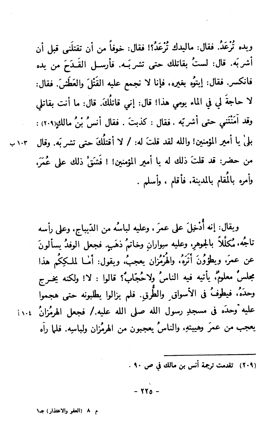 ويده ترعد. فقال: ما ليدك ترعد؟! فقال: خوفاً من أن تقتلني قبل أن أشربه. قال: لست بقاتلك حتى تشربه. فأرسل القدح من يده فانكسر. فقال: إيتوه بغيره, فإنا لا نجمع عليه القتل والعطش. فقال: لا حاجة لي في الماء يومي هذا! قال: إني قاتلك. قال: ما أنت بقاتلي وقد آمنتني حتى أشربه. فقال: كذبت. فقال أنس بن مالكٍ: بلى يا أمير المؤمنين! والله لقد قلت له:/ لا أقتلك حتى تشربه. وقال من حضر: قد قلت ذلك له يا أمير المؤمنين!! فشق ذلك على عمر, وأمره بالمقام بالمدينة, فأقام, وأسلم.