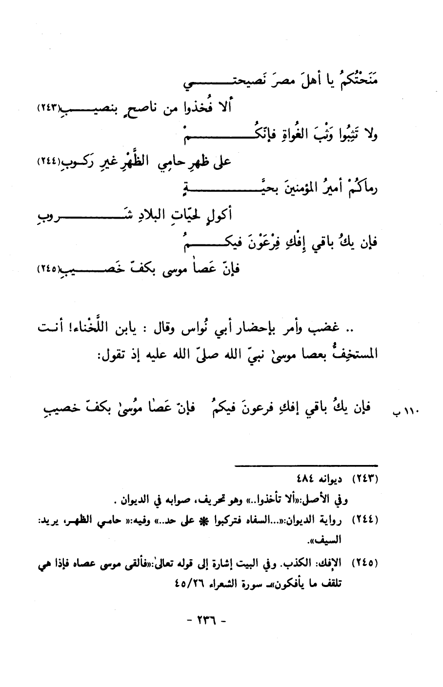 .. غضب وأمر بإحضار أبي نواس وقال: يا بن اللخناء! أنت المستخف بعصا موسى نبي الله صلى الله عليه وسلم إذ تقول: