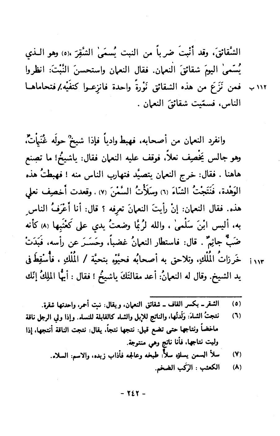وانفرد النعمان من أصحابه, فهبط وادياً فإذا شيخٌ حوله غنيماتٌ, وهو جالس يخصف نعلاً, فوقف عليه النعمان فقال: يا شيخ! ما تصنع هاهنا. فقال: خرج النعمان يتصيد فتهارب الناس منه! فهبطت هذه الوهدة, فنتجت الشاء وسلأت السمن, وقعدت أخصف نعلي هذه. فقال النعمان: إن رأيت النعمان تعرفه؟ قال: أنا أعرف الناس به, أليس ابن سلمى, والله لربما وضعت يدي على كعثبها كأنه ضبٌ جاثمٌ. قال: فاستطار النعمان غضباً, وحسر عن رأسه, فبدت خرزات الملك, وتلاحق به أصحابه فحيوه بتحية/ الملك, فأسقط في يد الشيخ. وقال له النعمان: أعد مقالتك يا شيخ! فقال: أيها الملك إنك