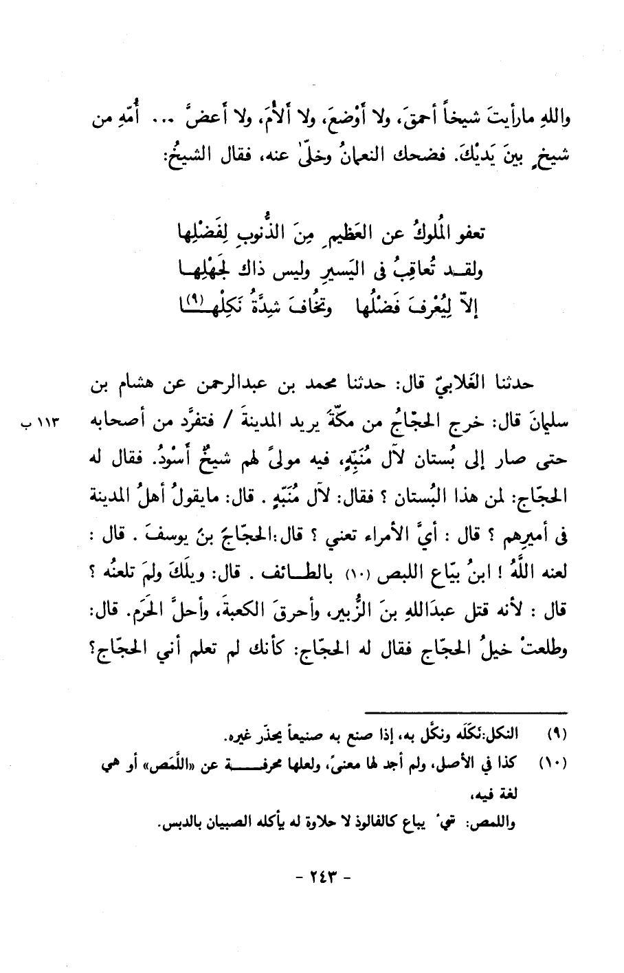 حدثنا الغلابي قال: حدثنا محمد بن عبد الرحمن عن هشام بن سليمان قال: خرج الحجاج من مكة يريد المدينة/ فتفرد من أصحابه حتى صار إلى بستان لآل منبهٍ, فيه مولىً لهم شيخٌ أسود. فقال له الحجاج: لمن هذا البستان؟ فقال: لآل منبهٍ. قال: ما يقول أهل المدينة في أميرهم؟ قال: أي الأمراء تعني؟ قال: الحجاج بن يوسف. قال: لعنه الله! ابن بياع اللبص بالطائف. قال: ويلك ولم تلعنه؟ قال: لأنه قتل عبد الله بن الزبير, وأحرق الكعبة, وأحل الحرم. قال: وطلعت خيل الحجاج فقال له الحجاج: كأنك لم تعلم أني الحجاج؟