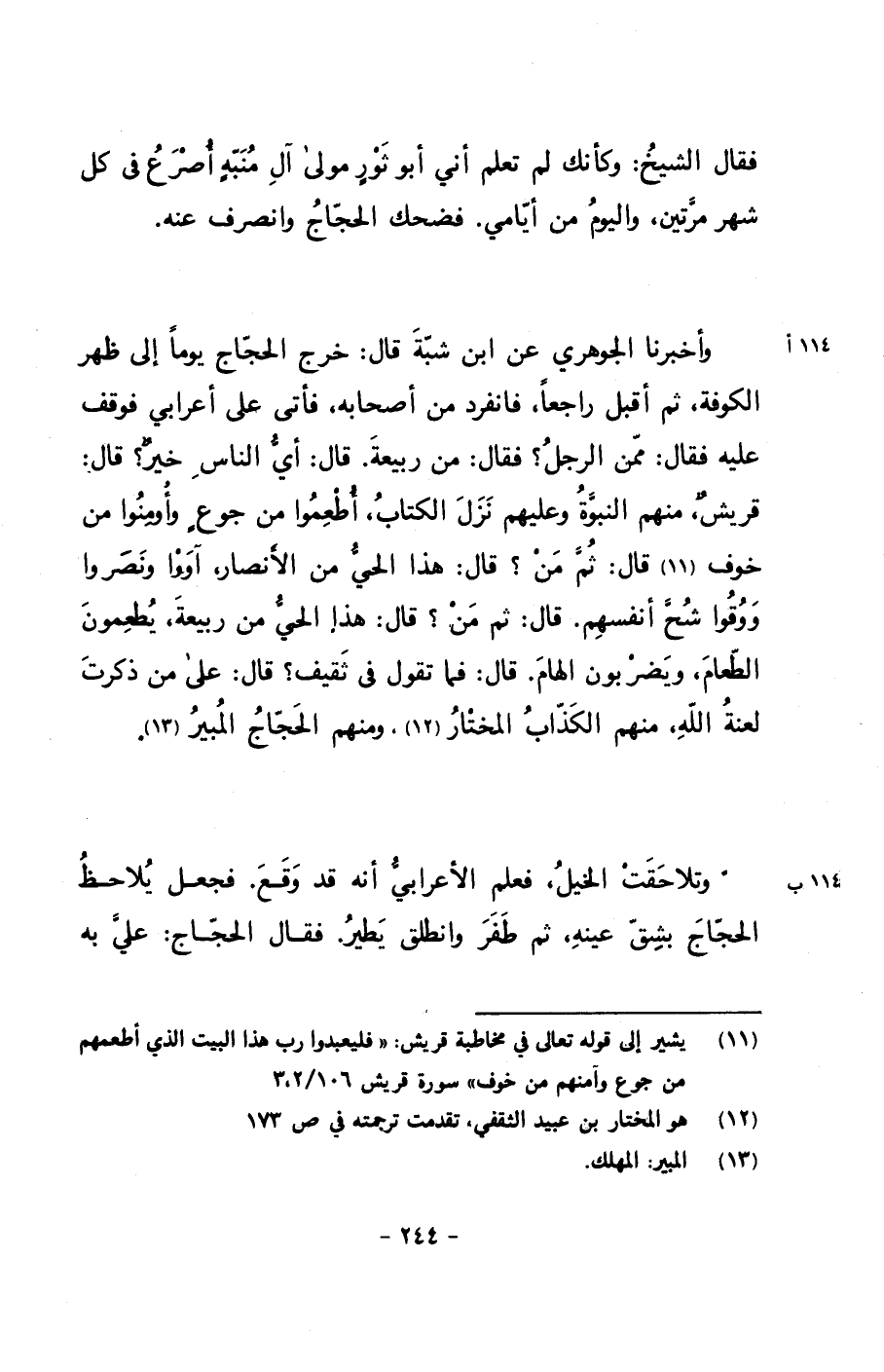 وأخبرنا الجوهري عن ابن شبة قال: خرج الحجاج يوماً إلى ظهر الكوفة, ثم أقبل راجعاً, فانفرد من أصحابه, فأتى على أعرابي فوقف عليه فقال: ممن الرجل؟ فقال: من ربيعة. قال: أي الناس خيرٌ؟ قال: قريشٌ, منهم النبوة وعليهم نزل الكتاب, أطعموا من جوعٍ وأومنوا من خوف قال: ثم من؟ قال: هذا الحي من الأنصار, آووا ونصروا ووقوا شح أنفسهم. قال: ثم من؟ قال: هذا الحي من ربيعة, يطعمون الطعام, ويضربون الهام. قال: فما تقول في ثقيف؟ قال: على من ذكرت لعنة الله, منهم الكذاب المختار, ومنهم الحجاج المبير.