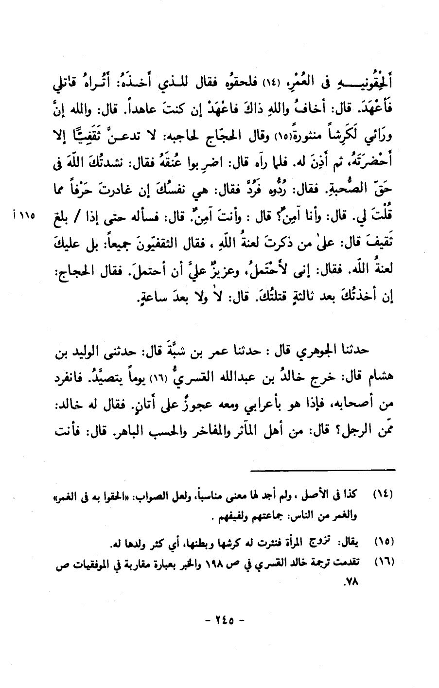 حدثنا الجوهري قال: حدثنا عمر بن شبة قال:حدثني الوليد بن هشام قال: خرج خالدٌ بن عبد الله القسري يوماً يتصيد. فانفرد من أصحابه, فإذا هو بأعرابي ومعه عجوزٌ على أتانٍ. فقال له خالد: ممن الرجل؟ قال: من أهل المآثر والمفاخر والحسب الباهر. قال: فأنت