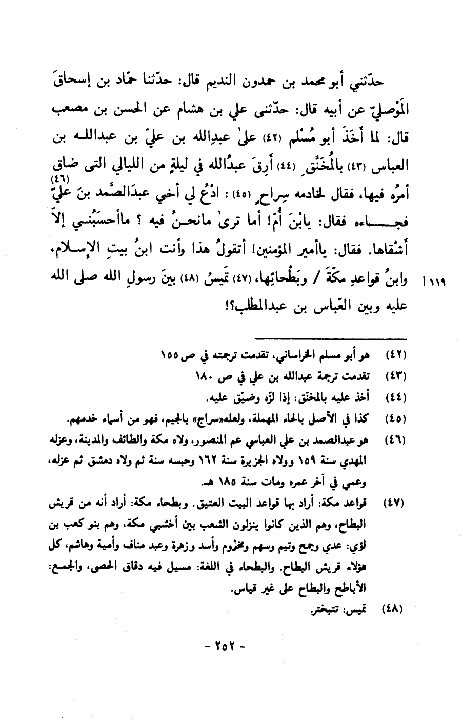 حدثني أبو محمد بن حمدون النديم قال: حدثنا حماد بن إسحاق الموصلي عن أبيه قال: حدثني علي بن هشام عن الحسن بن مصعب قال: لما أخذ أبو مسلم على عبد الله بن علي بن عبد الله بن العباس بالمخنق أرق عبد الله في ليلةٍ من الليالي التي ضاق أمره فيها, فقال لخادمه سراحٍ: ادع لي أخي عبد الصمد بن علي فجاءه فقال: يا بن أم! أما ترى ما نحن فيه؟ ما أحسبني إلا أشقاها. فقال: يا أمير المؤمنين! أتقول هذا وأنت ابن بيت الإسلام, وابن قواعد مكة/ وبطائحها, تميس بين رسول الله صلى الله عليه وسلم وبين العباس بن عبد المطلب؟!